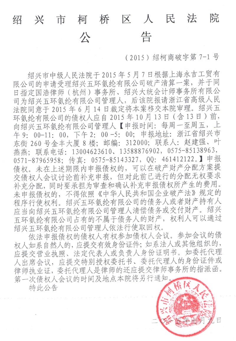 2015年5月7日,绍兴市中级人民法院受理绍兴五环氨纶有限公司破产清算一案,并指定国浩律师(杭州)事务所、绍兴大统会计师事务所有限公司为绍兴五环氨纶有限公司管理人。后该院报请浙江省高级人民法院同意于2015年6月14日裁定将本案移交绍兴市柯桥区人民法院审理。